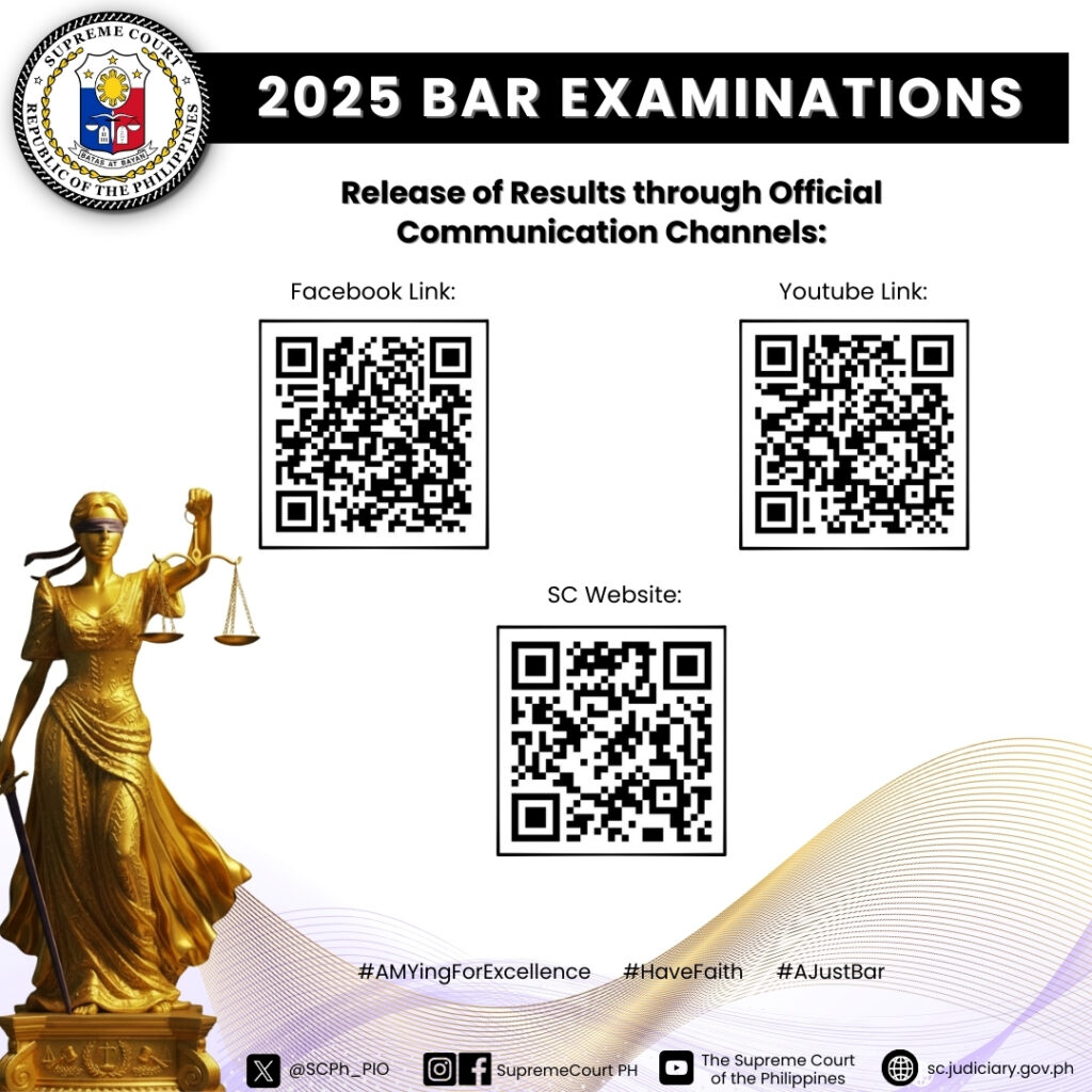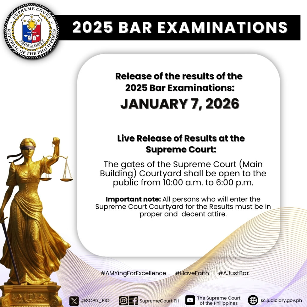 The Office of the #Bar2025 Chairperson, Associate Justice Amy C. Lazaro-Javier, has released the guidelines on the release of the results of the 2025 Bar Examinations on January 7, 2026 (Wednesday).